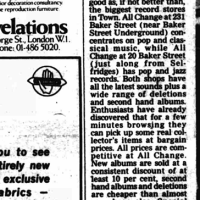 “Enter Baker Street from either end and one of the first shops you'll see is an All Change record shop. That's what is called strategic positioning! The first All Change opened in Baker Street three years ago, the second just last year, and between them they now hold a stock as good as, if not better than, the biggest record stores in Town.”