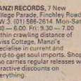 Comment: I was a regular at the shop from late 1977, when I bought some of my first records there age 13, till some time in the early/mid-1980s when I moved out of the area. I used to get paid for my paper round on Saturday morning and spend the lot in Manzi's every week. I started out buying rock'n'roll and reggae stuff but noticed the racks of punk/new wave LP's and singles and got totally drawn into that scene. I think I bought the first Clash LP, first Damned LP, Pistols NMTB and Richard Hell and the Voidoids - Blank Generation in one go to get started, around November or December 1977. I think one of the guys who worked there managed The Ruts for a while...? I can't remember the names of the staff there but I used to chat to them all quite a bit, I loved it there.