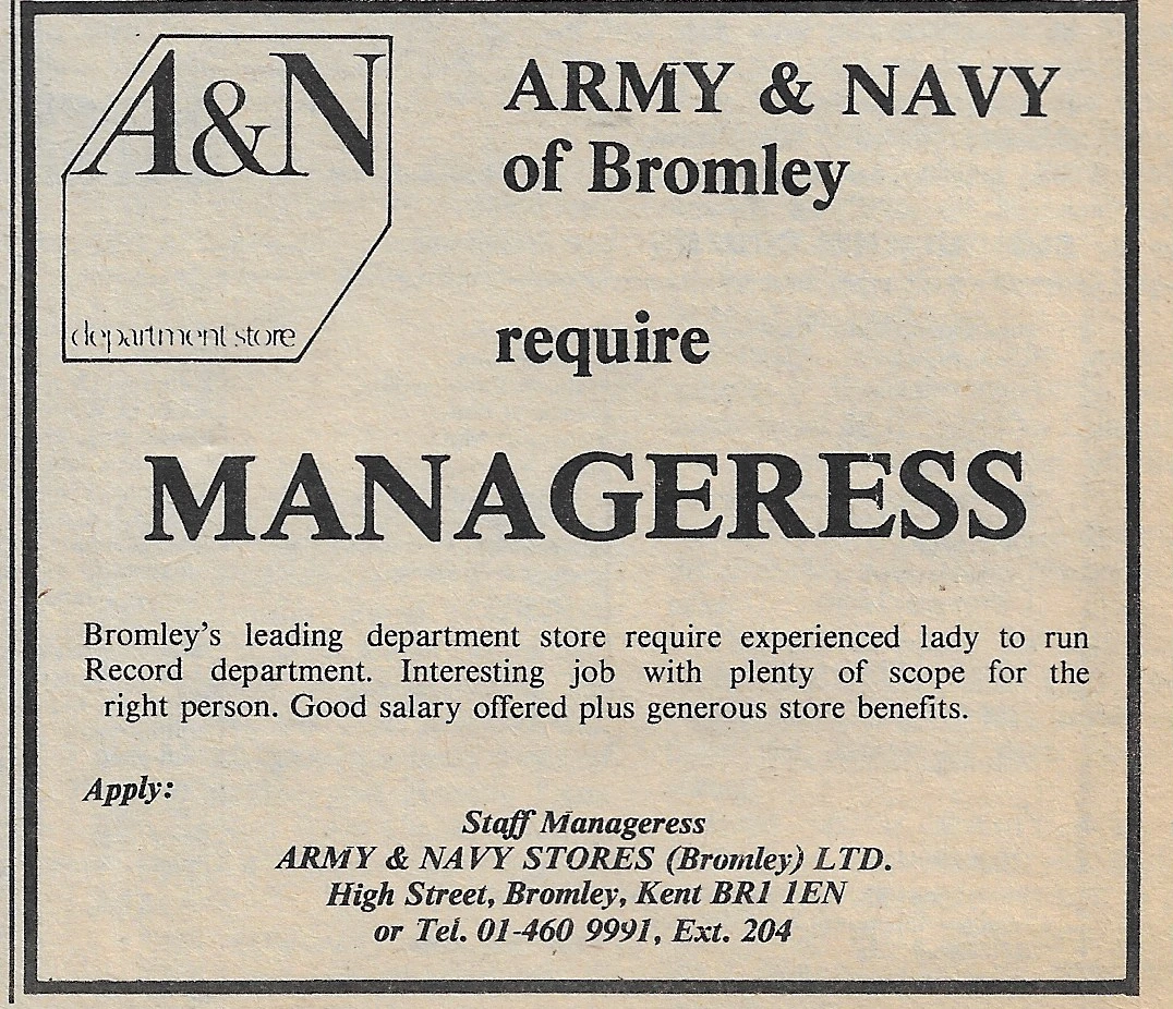 “VICTORIA ARMY & NAVY STORES LTD. have vacancies for EXPERIENCED FEMALE ASSISTANTS in their GRAMOPHONE DEPT.”