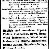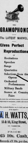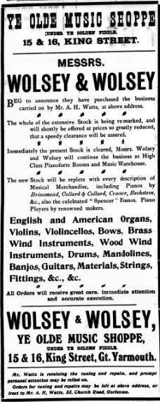 Arthur. H. Watts probably opened his Piano Warehouse at 15 & 16 King Street Yarmouth early in 1892. In January 1899 customers were invited to come and inpsect the latest Edison Bell Phonograph, price £6 6s with new cylinders at 1s and the Gramophone priced at £5 10s. In 1910 the shop was taken over by Wolsey and Wolsey and Mr Arthur Watts becomes a piano tuner full-time. (Tony Langford 2025)