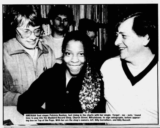 “AMERICAN Soul singer Patrice Rushen, fast rising in the charts with her single 'Forget-me-nots', found time to pop into the Bluebird Record Shop, Church Street, Marylebone to sign autographs before appearing live on Top of the Pops. With her are the shop's owners, left: Billy Carruthers and Billy Russell.”