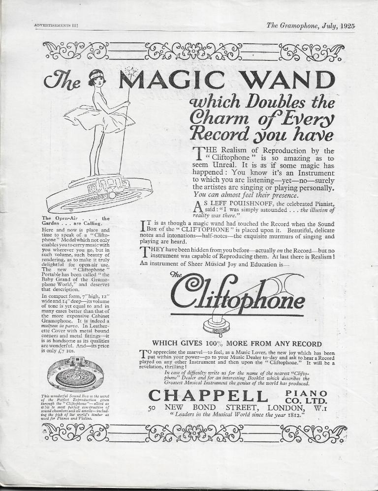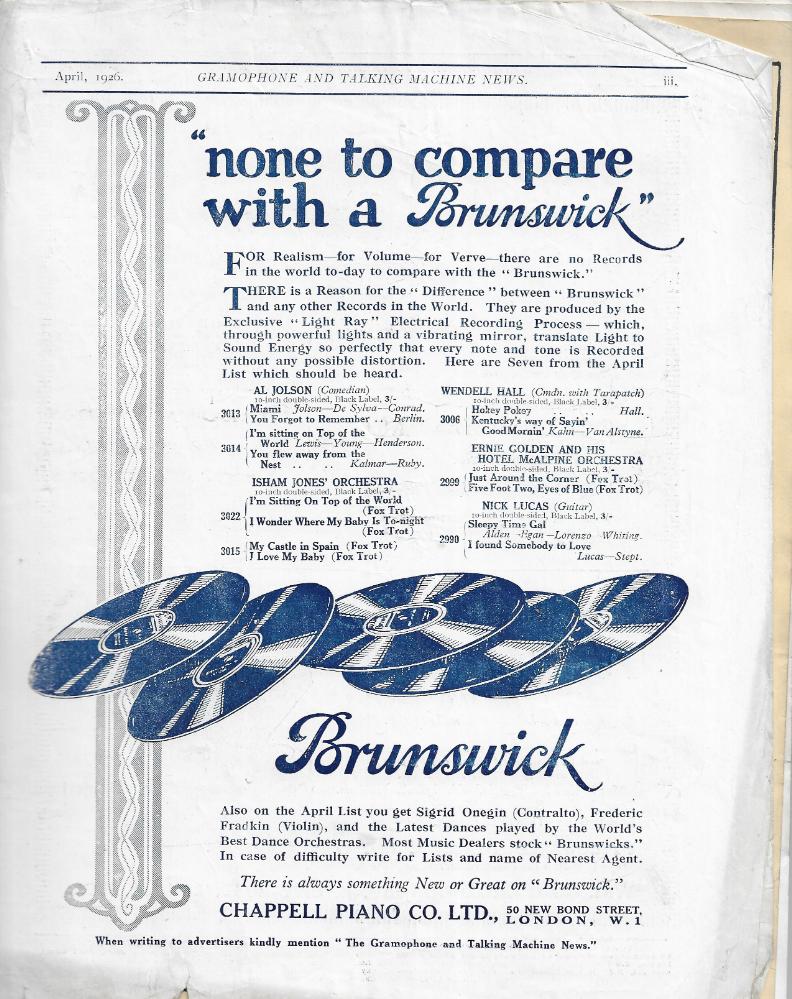 “CHAPPELL RECORDS – RECORDS OF THE LATEST CHAPPELL BALLAD CONCERT SUCCESSES AND OTHER NOVELTIES IN COURSE OF PREPARATION. May be heard at all Music Sellers, Gramophone Dealers, and CHAPPELL & CO., Ltd , 50, New Bond Street, London, W. 1.”