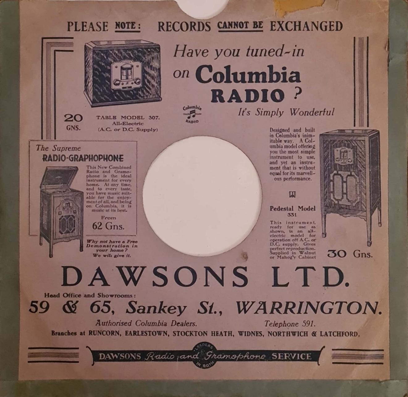 I found this in the 'Runcorn Weekly News' dated 23rd March 1923: “DAWSON'S Ltd. The Gramophone Specialists, 59 & 65 SANKEY ST., WARRINGTON.” ...and these addresses in the 17th October 1930 edition: “DAWSONS Ltd. have pleasure in announcing a Gramophone Recital to be given in the Baths Assembly Hall, Runcorn on Thursday, Oct. 30th, 1930 at 7.45 p.m. ADMISSION FREE by Ticket only Obtainable at DAWSONS Ltd., CHURCH ST., RUNCORN and at 33 ALBERT RD. and 13 VICTORIA RD., WIDNES. Head Office: 59 & 65 SANKEY STREET, WARRINGTON.”
