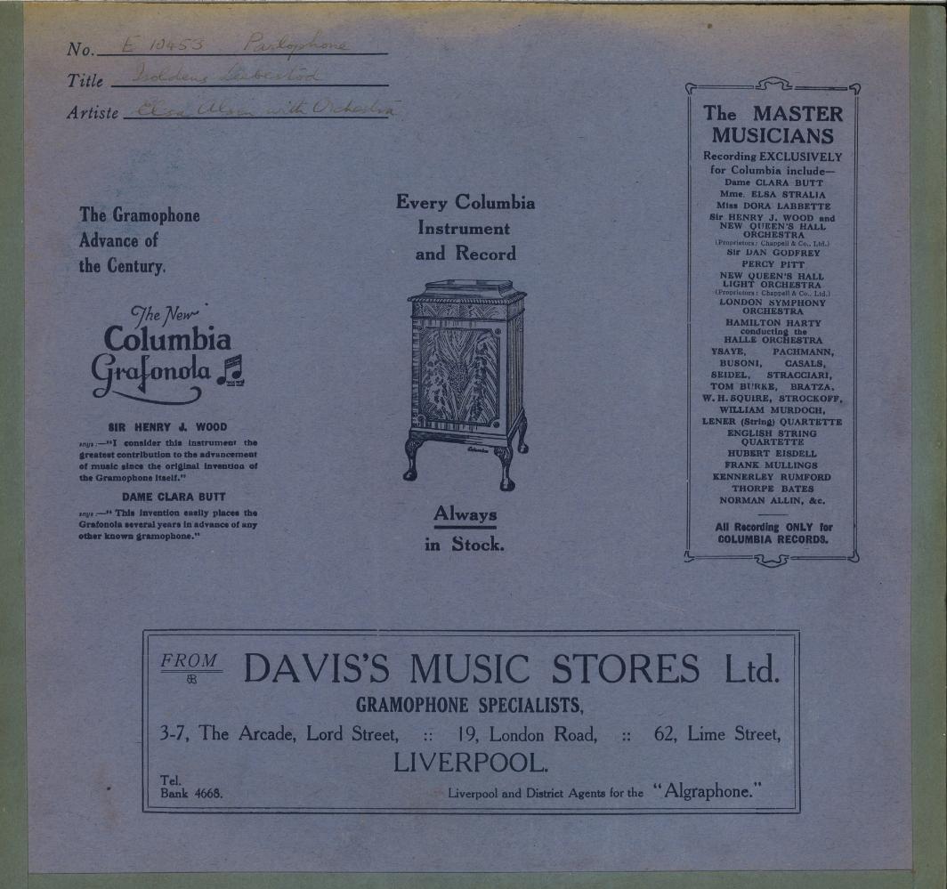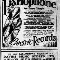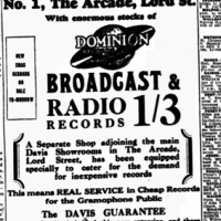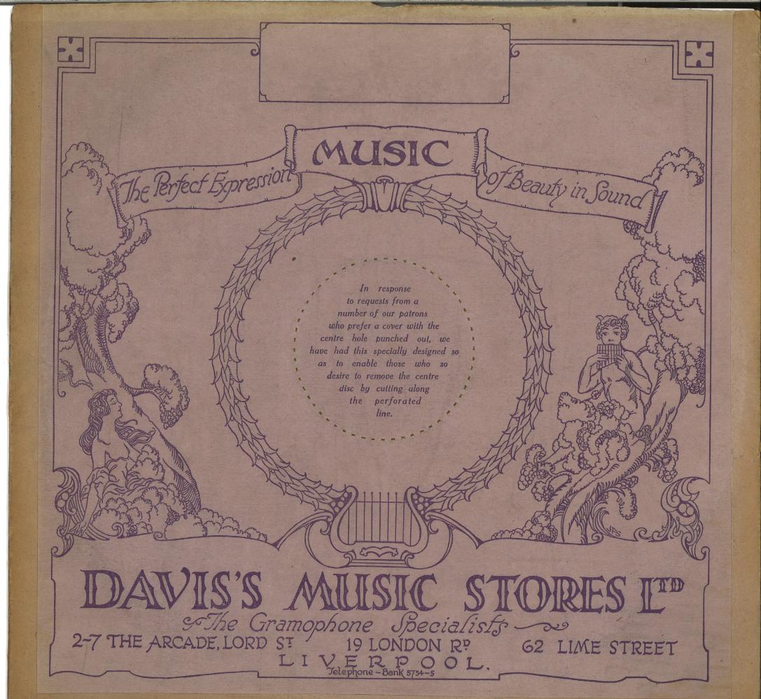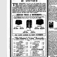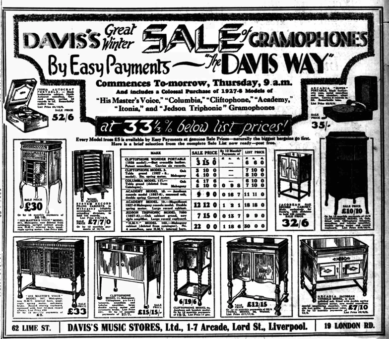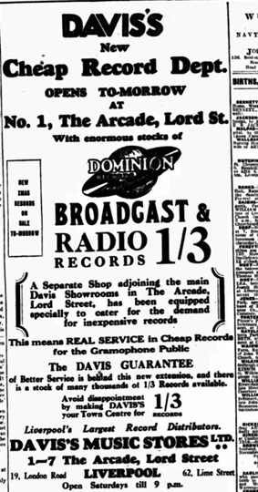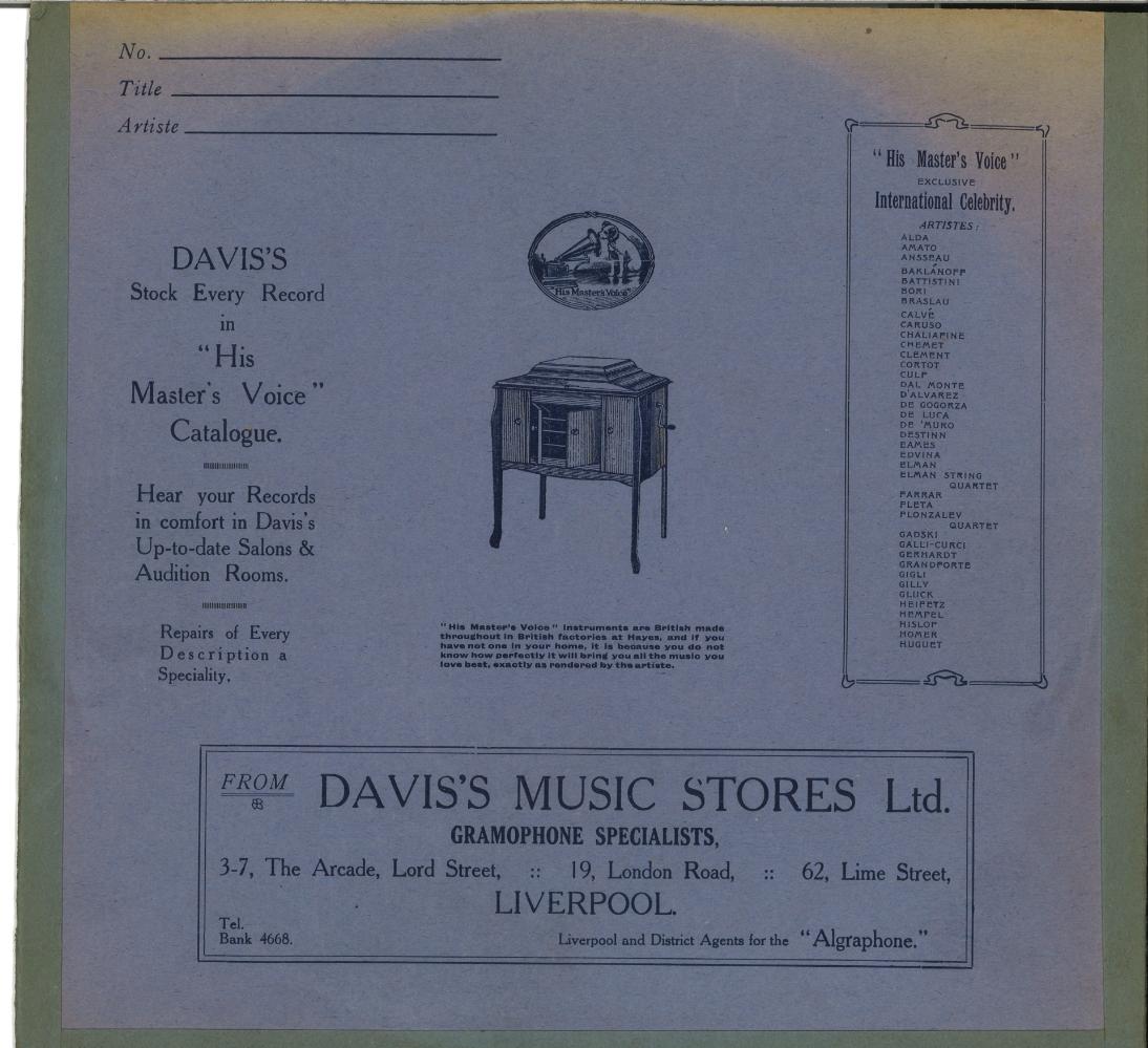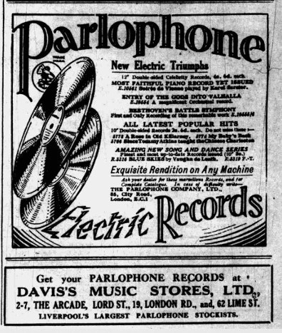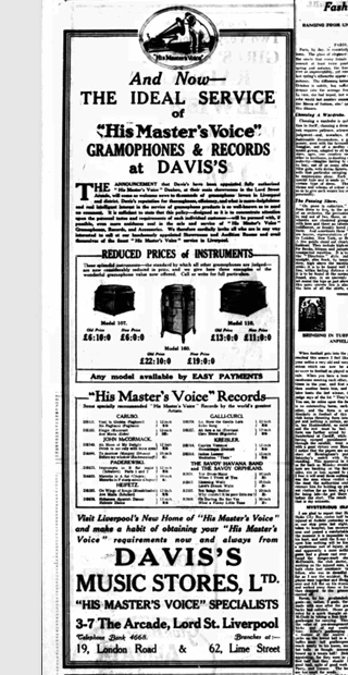 “DAVIS'S MUSIC STORES LTD Have Pleasure in Announcing the Opening of their New His Master's Voice Depot at 62, LIME STREET On Saturday, May 16th. Davis's have been appointed fully authorised H.M.V. Agents at this New Depot.”