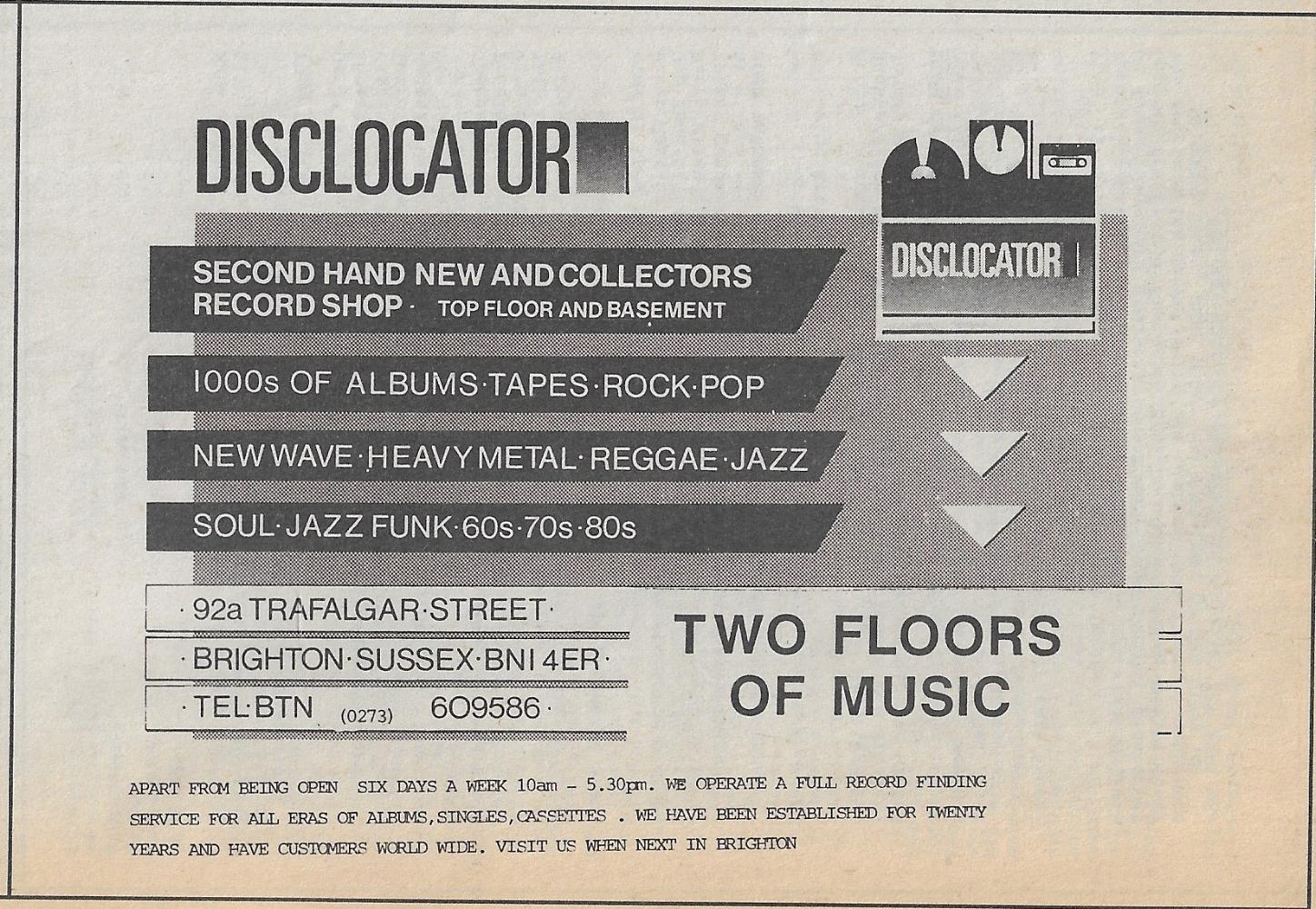 Comment: This was located right by Brighton Technical College and was a second-hand record shop on two floors, street level and basement. The Disclocator shop was initially located in Redcross Street, Brighton, in the mid 1980s and was owned by Ed Farn. This morphed into Across The Tracks and at the end of 1988 Alan Childs came aboard with a background of collectable record sales in Record Collector Magazine. In May 1989, Across The Tracks opened in 34 Sydney Street, Brighton, BN1 4EP. More shops followed in Trafalgar Street and Warwick Street precinct in Worthing. However in 1994 Across The Tracks moved everything to its current location, 110 Gloucester Road, Brighton, BN1 4AF.