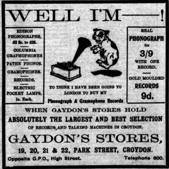 HOLD ABSOLUTELY THE LARGEST AND BEST SELECTION OF RECORDS AND TALKING MACHINES IN CROYDON. GAYDON'S STORES, 19, 20, 21 & 22, PARK STREET, CROYDON. Opposite G.P.O., High Street. Telephone 600."