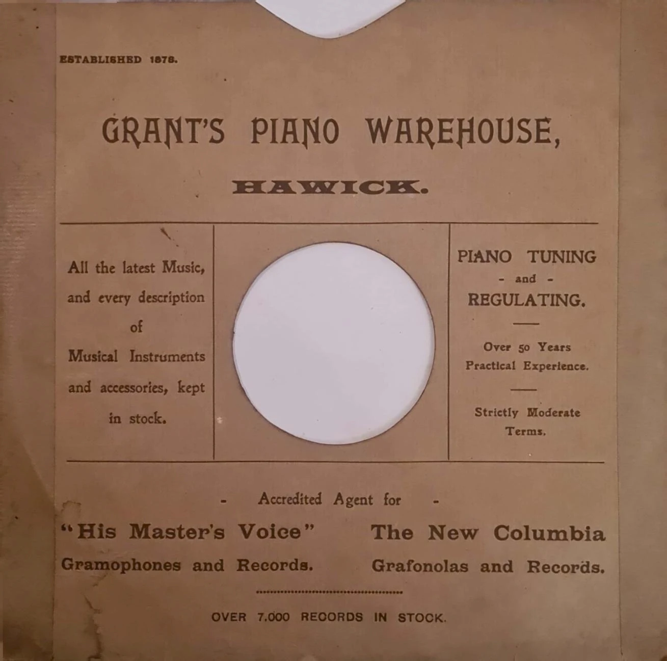“PRICES BACK TO PRE-WAR PRICE – H.M.V. RECORDS: Plum 10 inch Now 3/-, Plum 12 inch Now 4/6, Black 10 inch Now 4/6, Black 12 inch Now 6/6. ZONOPHONE: Now 2/6 and 4/-. Grant’s Piano Warehouse, Hawick.”
