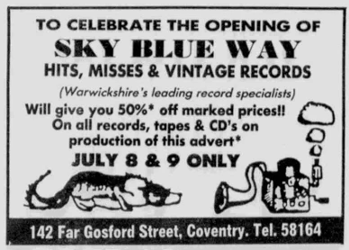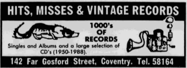 “HITS MISSES & VINTAGE RECORDS 142 Far Gosford Street, Coventry (0203) 58164, announce the launch of THE VINTAGE RECORD CLUB. Especially aimed at the collector of original released records, original labels and vintage music, this club has an annual membership fee of £25.”