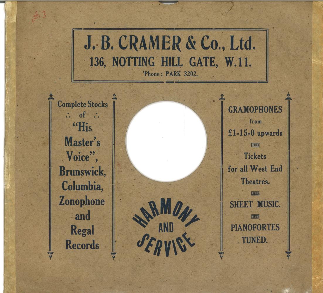 “FOR ALL MUSICAL requirements visit CRAMER SHOWROOMS, 136 NOTTING HILL GATE, W 11. PIANOS; HMV, COLUMBIA, BRUNSWICK, ZONOPHONE GRAMOPHONES.”