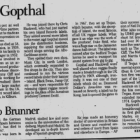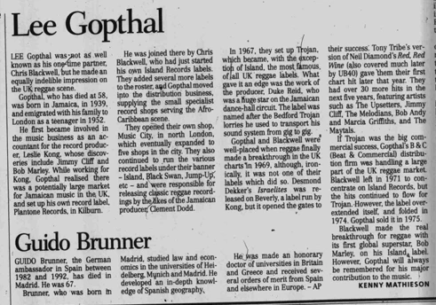 Artist Biography. 1 March 1939, Constant Spring, Kingston, Jamaica, West Indies, d. 29 August 1997. Gopthal is regarded as a pioneer in promoting Jamaican music. He moved to the UK in 1952 where he qualified as an accountant, and by the early 60s was representing producer Leslie Kong in the UK. Initially, Gopthal was involved in providing records for the West Indian population through his primary venture, Pyramid Records. By the early 60s Chris Blackwell had arrived in the UK and joined forces with Gopthal, who distributed Black Swan and Island Records pressings under the Beat And Commercial banner. The association led to the inauguration of the Muzik City chain, which sold Jamaican music within the Afro-Caribbean community. The shops were opened in and around London and included the legendary Desmond’s Hip City in Brixton. In 1967 Gopthal’s Pyramid label released Desmond Dekker’s ‘The Israelites’, which topped the UK charts two years after its release and is acknowledged as the first reggae tune to conquer the US charts. Gopthal and Blackwell co-founded Trojan Records in 1967, releasing Jamaican hits and allocating labels to represent the growing number of producers, including Lee Perry, Joe Gibbs, Duke Reid, Clancy Eccles and, for a brief period, Coxsone Dodd. Gopthal also worked with UK-based performers, including Dandy Livingstone, whose production of Tony Tribe’s version of Neil Diamond’s ‘Red Red Wine’ gave the company its first reggae hit on the UK chart. Following his label’s early chart success Gopthal also enjoyed mainstream hits with ‘The Liquidator’, by Harry J.’s Allstars, ‘Long Shot Kick De Bucket’ by the Pioneers, ‘Wonderful World, Beautiful People’ by Jimmy Cliff, and the double a-side, ‘Return Of Django’/‘Dollar In The Teeth’, by the Upsetters. The hits continued in abundance following the departure of Blackwell, who decided to concentrate on the lucrative rock market, although the Wailers later emerged as the label’s most significant asset. By 1974, with increasing financial problems, Trojan were unable to compete with the major record companies, and the label was eventually sold to Saga Records. Gopthal maintained a low profile within the music industry until the late 1970s when he decided to pursue a career in commerce.