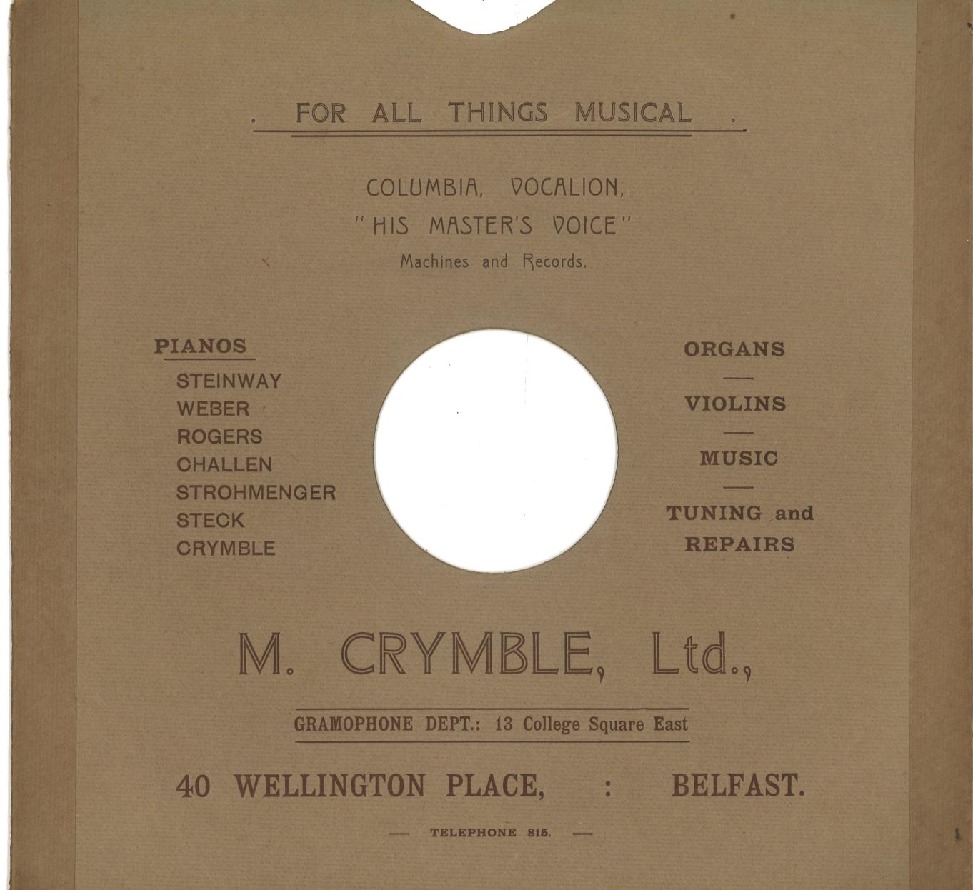 I found this in the 'Belfast Newsletter' dated 9th February 1925: “You Can Hear the above Records At M. CRYMBLE'S, Ltd., 40 Wellington Place. GRAMOPHONE DEPT. - 13 COLLEGE SQUARE EAST (round the corner).” ...and this in the 'Northern Whig' dated 14th November 1928: “These Gramophones can be seen and heard at CRYMBLE S, 40, Wellington Place. Gram. Salon:- 13, College Square East. Accredited Dealers to the Gramophone Co., Ltd.”