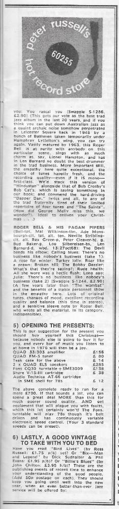 I was a young Mormon missionary serving in the UK when I happened upon a copy of "The Good Noise." It changed my life. When I was assigned to Plymouth in 1968, I sought out the Hot Record Shop, where I met Pete and asked him to educate me about jazz. He sold me two records, Brubeck's "Take Five" and Archie Shepp's "Four for Trane." I assimilated "Take Five" quite handily, but Shepp was another matter. Took me many listens before the music's logic and beauty finally settled in. I love jazz to this day and will always be grateful to Mr. Russell for sharing his time and expertise with a young American eager to learn