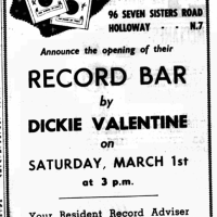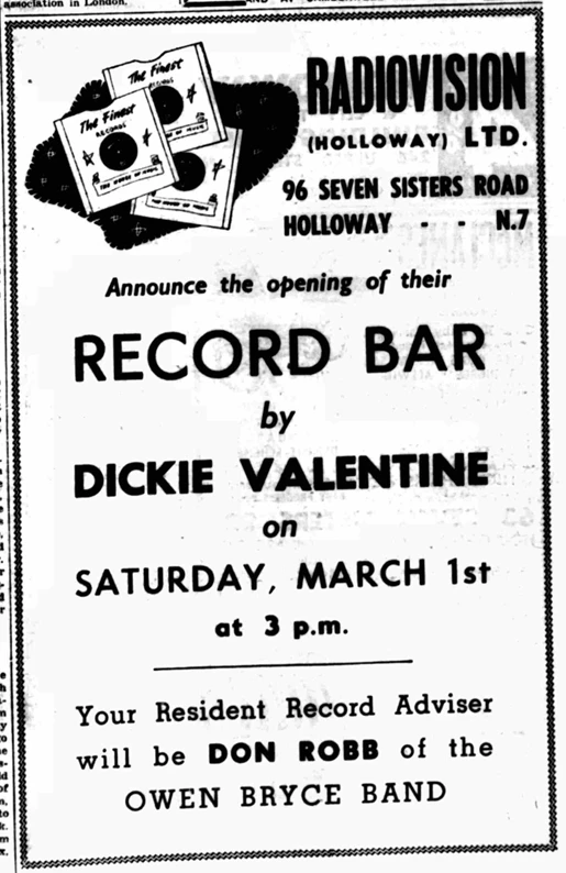 “RADIOVISION (HOLLOWAY) LTD., 96 SEVEN SISTERS ROAD, HOLLOWAY, N.7 Announce the opening of their RECORD BAR by DICKIE VALENTINE on SATURDAY, MARCH 1st at 3 p.m. Your Resident Record Adviser will be DON ROBB of the OWEN BRYCE BAND.”