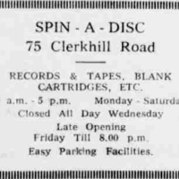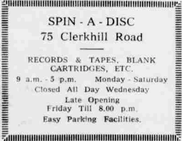 “SPIN - A - DISC, 75 Clerkhill Road, Peterhead. RECORDS & TAPES, BLANK CASSETTES, CARTRIDGES, ETC. Open 9 a.m. - 5 p.m. Monday – Saturday.”… and this advert in the 8th November 1977 edition:
