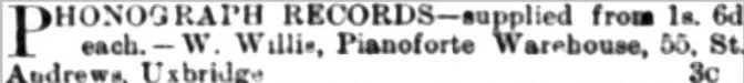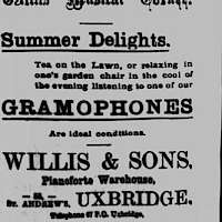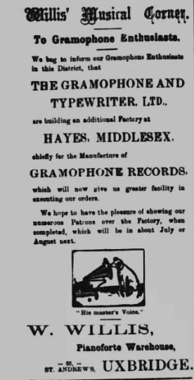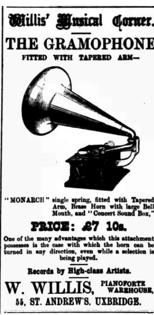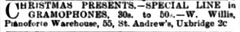 W. Willis appears to open his Pianoforte Warehouse in 1902 at 55 St. Andrews, Uxbridge. He also sells Gramophone & records. He continues to advertise until April 1907.