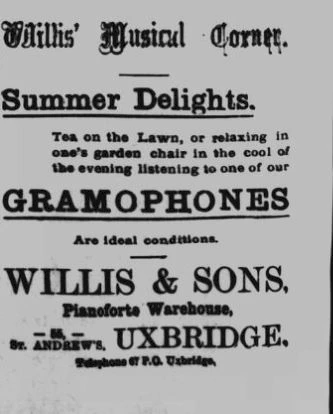 I found this in the 'Uxbridge & West Drayton Gazette' dated 1st May 1925: “Willis & Sons Pianos & Gramophone Showrooms, 55 & 56, St. Andrews, Uxbridge.”