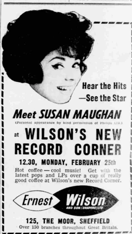 "Star Green 'un" dated 23rd February 1963:“WILSON’S NEW RECORD CORNER Opens 12.30, MONDAY, FEBRUARY 25! Hot coffee - cool music! Get latest pops and LPs over a cup of good coffee at Wilson’s new Record Corner, 125, THE MOOR, SHEFFIELD. Over 150 branches throughout Great Britain.”